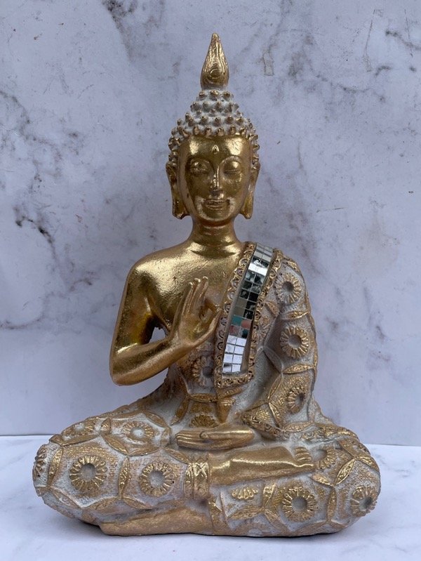 Estatuilla de Buda meditando, que representa la serenidad ,la sabiduría interior. Y protección. Acabado dorado con incrustaciones de espejos. Tamaño aproximado: 22x15 cm.