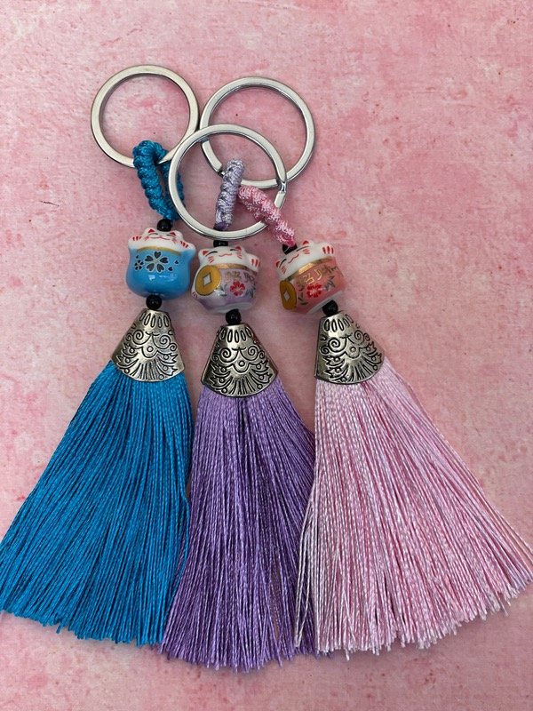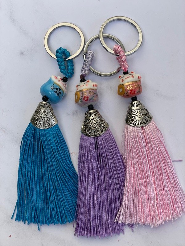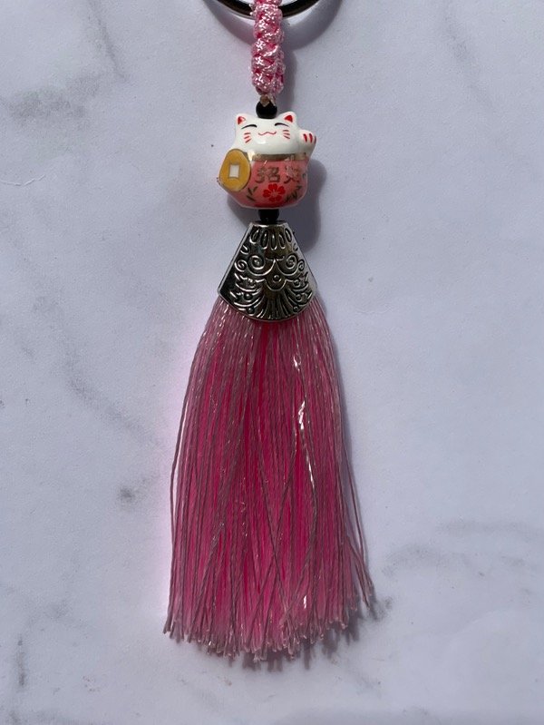 Llavero gatito de cerámica para llevar como amuleto de buena fortuna.